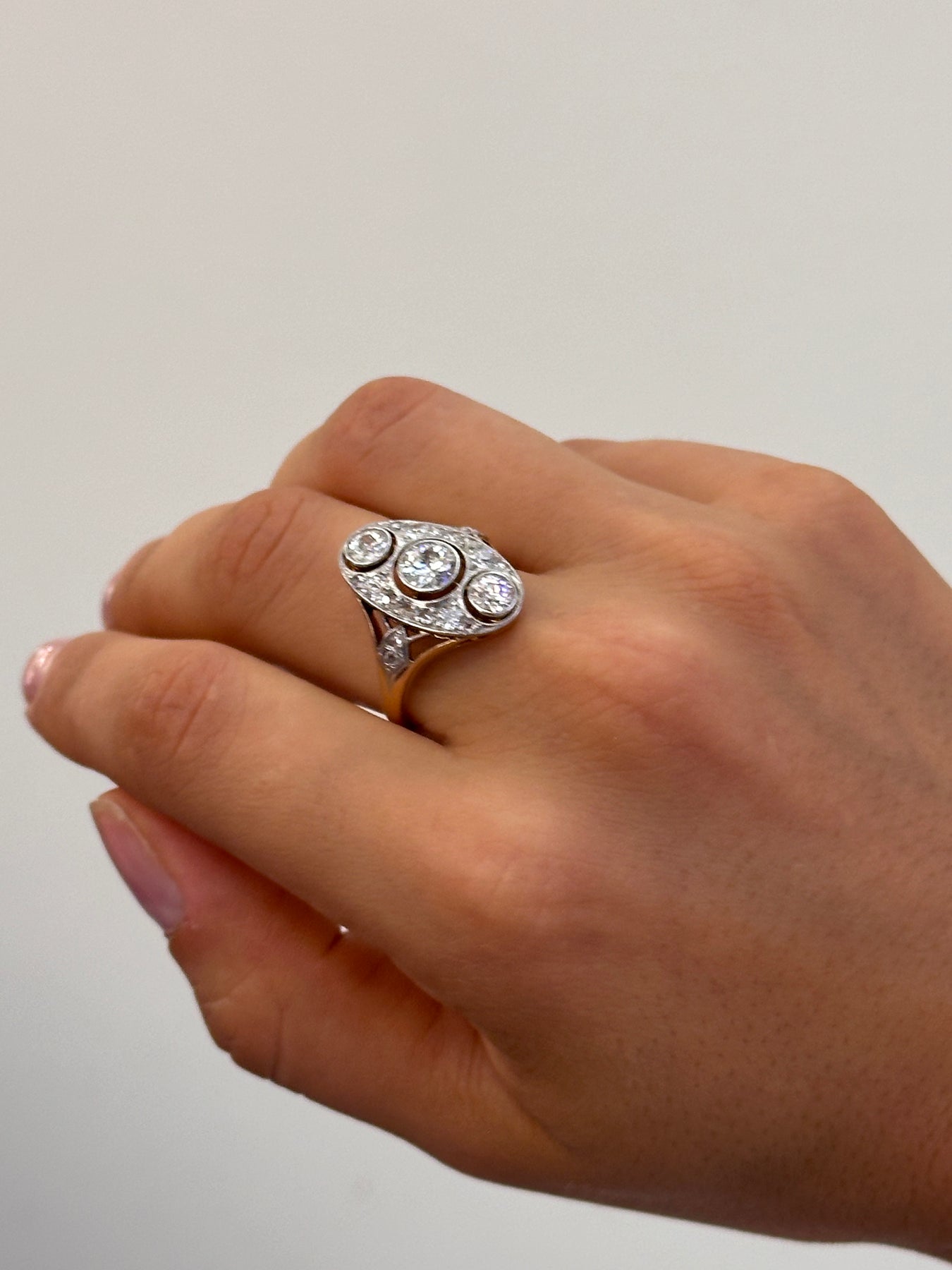 Superbe bague Art Déco en or bicolore jaune et blanc, ornée de trois diamants ronds sertis clos, disposés dans un motif géométrique emblématique des années 1920-1930. Le diamant central d’environ 0,70 ct, présentant une légère piqûre naturelle, est encadré de deux diamants d’environ 0,50 ct chacun. L’ensemble est sublimé par un pavage délicat de petits diamants, qui apporte un éclat raffiné tout en respectant l’élégance symétrique du style Art Déco. Un bijou d’exception pour les passionnés de pièces anciennes et de design intemporel.